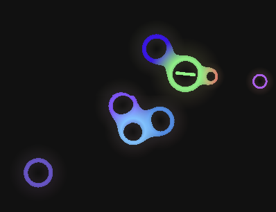 Now I'm going to go ahead and dive right into the most interesting aspect of the game, the liquid effects between object collision. This is done using the same technique as for metaballs. Metaballs (demo) work by combining gradients and then sampling the result. For example, here is what the game looks like before processing: